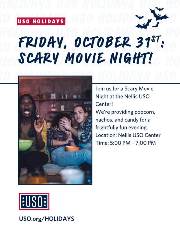 Join us for a Scary Movie Night at the Nellis USO Center. We’re providing popcorn, nachos, and candy for a frightfully fun evening.