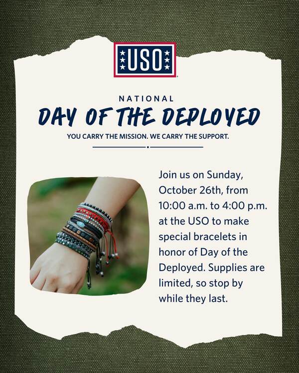 Join us on Sunday, October 26th, from 10:00 a.m. to 4:00 p.m. at the USO to make special bracelets in honor of Day of the Deployed. Supplies are limited, so stop by while they last.