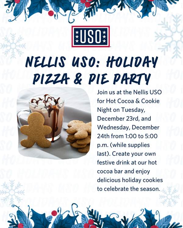 Join us at the Nellis USO for Hot Cocoa & Cookie Night on Tuesday, December 23rd, and Wednesday, December 24th from 1:00 to 5:00 p.m. (while supplies last). Create your own festive drink at our hot cocoa bar and enjoy delicious holiday cookies to celebrate the season.