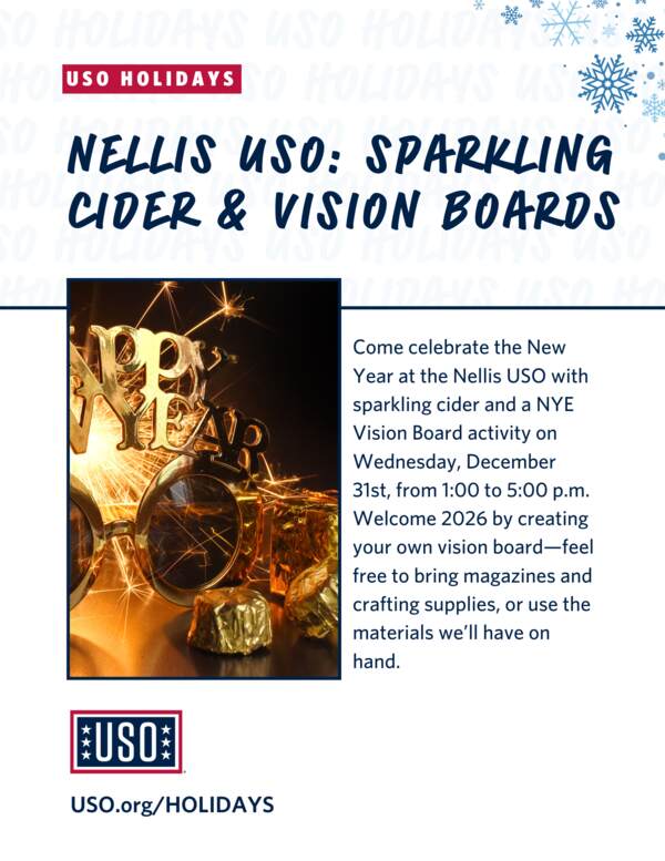 Come celebrate the New Year at the Nellis USO with sparkling cider and a NYE Vision Board activity on Wednesday, December 31st, from 1:00 to 5:00 p.m. Welcome 2026 by creating your own vision board—feel free to bring magazines and crafting supplies, or use the materials we’ll have on hand.